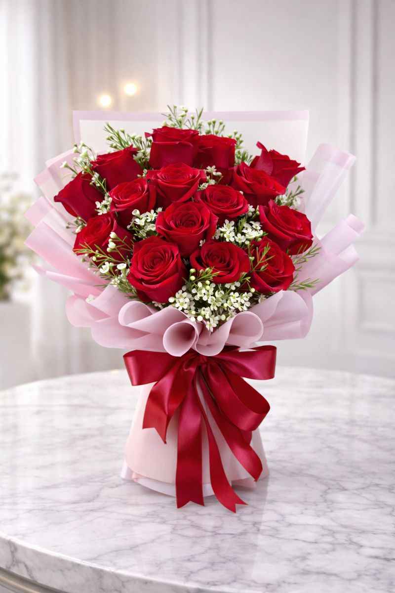 For those who love traditional romance with a softer touch, a red rose bouquet paired with delicate white baby’s breath is a perfect option. The contrast between deep red roses and light fillers creates a full, romantic look that feels luxurious while remaining budget-conscious.