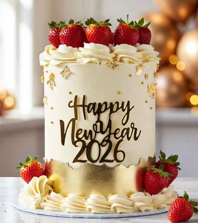 كعكة New-Year-Allure هي كعكة احتفالية طويلة مزينة بالفراولة واللمسات الذهبية وعبارة "Happy New Year 2026" (عام جديد سعيد 2026) التي تجذب الأنظار على الفور. وهي مثالية للعائلة المقربة والأصدقاء المقربين والاحتفالات الهامة لأنها تبدو فخمة وتضفي جوًا احتفاليًا وتحوّل أي تجمع إلى حفلة رأس سنة مناسبة مع حلوى مذهلة.