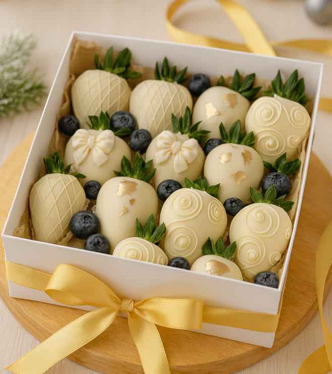 الفراولة المغطاة بالشوكولاتة الفاخرة هي علبة فراولة نظيفة وعالية الجودة مغطاة بشوكولاتة بيضاء ناعمة ذات ملمس أنيق ولمسات ذهبية. هذه الهدية مثالية للأصدقاء والمضيفين والأزواج وحتى للمفاجآت التي تعبر عن "تفكيرك فيهم" لأنها بسيطة وأنيقة وجاهزة للنشر على إنستغرام، كما أنها سهلة المشاركة وخفيفة بما يكفي للاستمتاع بها بعد وجبة كبيرة في رأس السنة الجديدة.