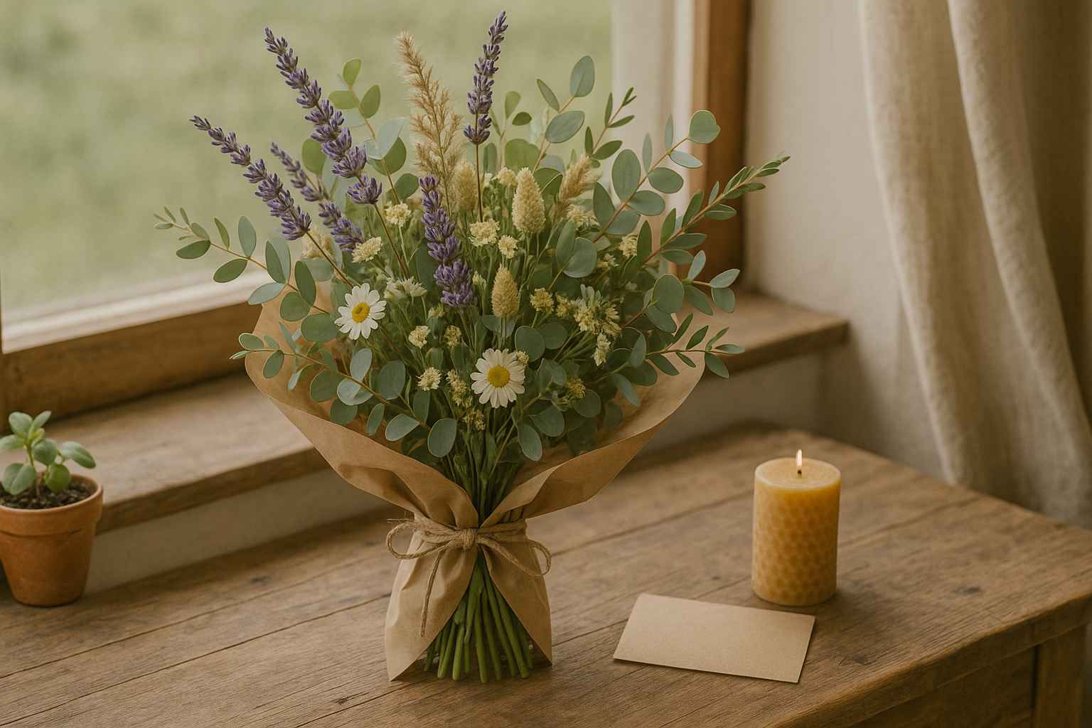 الزهور الموصى بها: اللافندر، الأوكالبتوس، الأزهار البرية المحلية، مزيج من الأوراق الخضراء الكثيفة