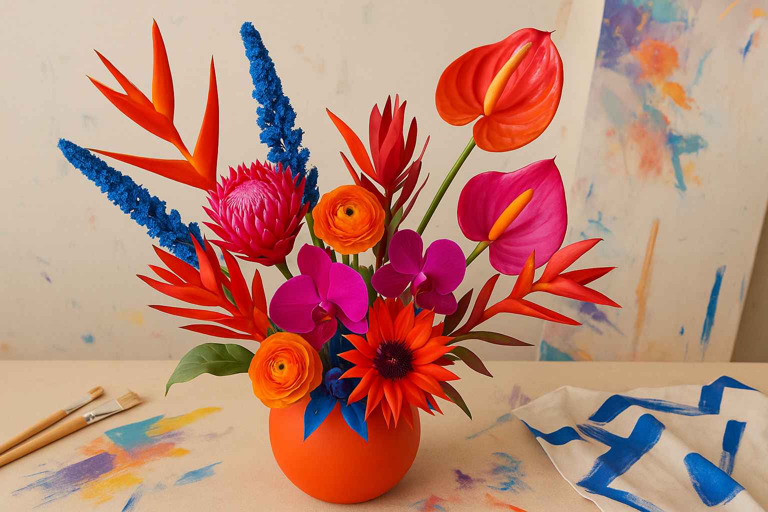 الزهور الموصى بها: بروتيا، أزهار استوائية، أنثوريوم، ألوان مختلطة زاهية