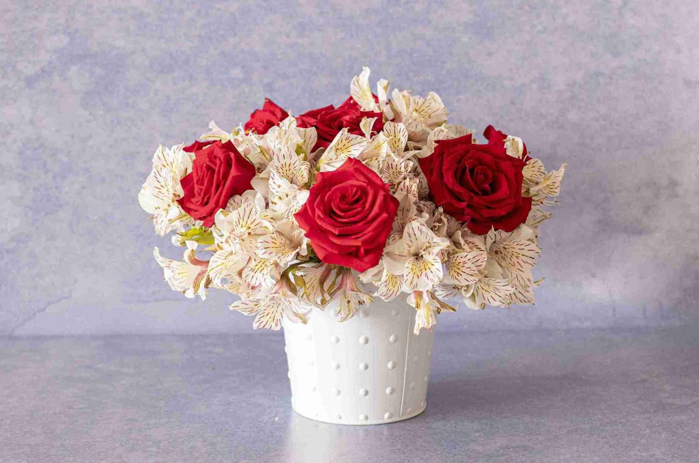 لتحديث الباقة الرومانسية الكلاسيكية، فكر في دمج أنسجة وألوان متباينة. امزج الورود الحمراء والوردية مع النباتات الخضراء مثل الأوكالبتوس أو السرخس، المتوفرة في متناول يدك عند استكشاف الزهور عبر الإنترنت. هذا لا يضيف فقط لمسة عصرية، بل يعزز أيضًا الجاذبية البصرية. لا تتردد في دمج أزهار أصغر حجمًا مثل زهرة النفس أو الرانونكولوس لإضافة لمسة رقيقة وأثيرية إلى الترتيب.