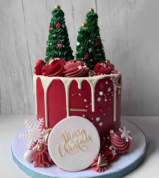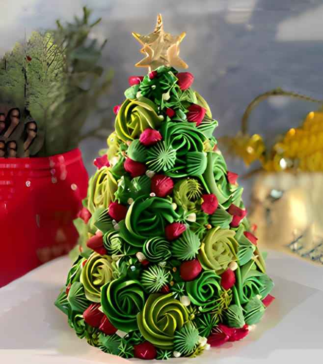 Imagine gifting a vibrant bouquet of red roses and lilies accompanied by a stunning Christmas Pine Cake. This cake, shaped like a Christmas tree, features elegant swirls and an edible star on top, making it a visual and culinary delight. The festive aesthetic of the cake harmonizes with the vibrant colors of Christmas blooms, creating a gift duo that radiates holiday cheer.