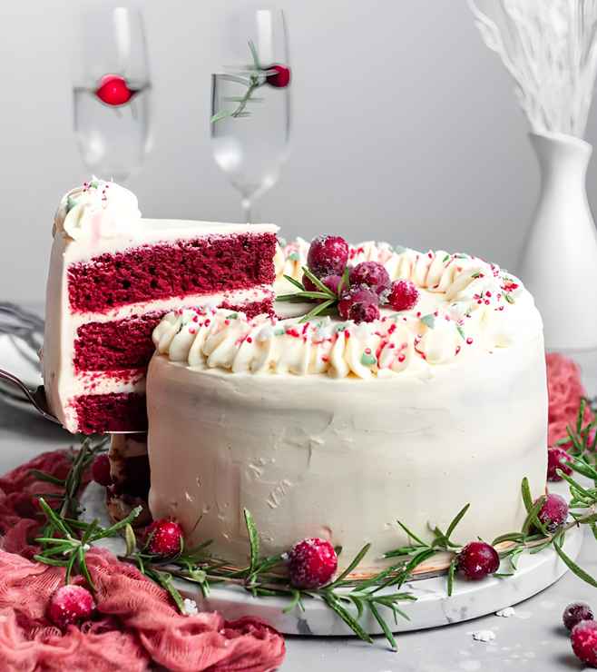 Pair a classic bouquet of white lilies and red carnations with a Frosty Red Velvet Cake. This luscious dessert is layered with smooth white icing and topped with fresh raspberries, bringing a touch of elegance to your festive offerings. The bright red hue of the cake complements the blooms, while the rich flavors add a touch of indulgence to the gift.