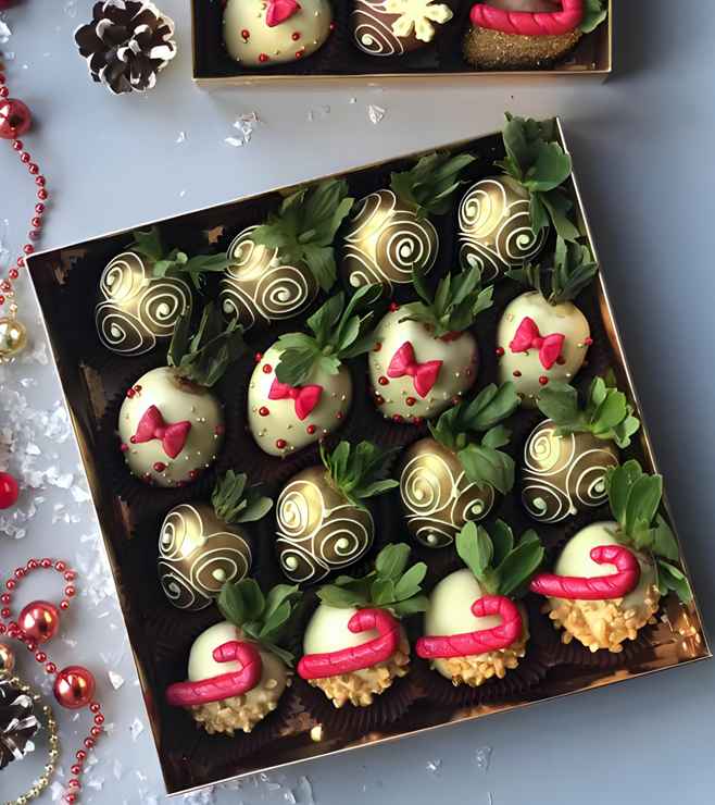 Pair a bouquet of vibrant red and white blossoms with a box of Santa’s Choco-Dipped Strawberries. These strawberries, dipped in rich Belgian chocolate and adorned with festive decorations, are a luxurious treat that brings sophistication to your gift.