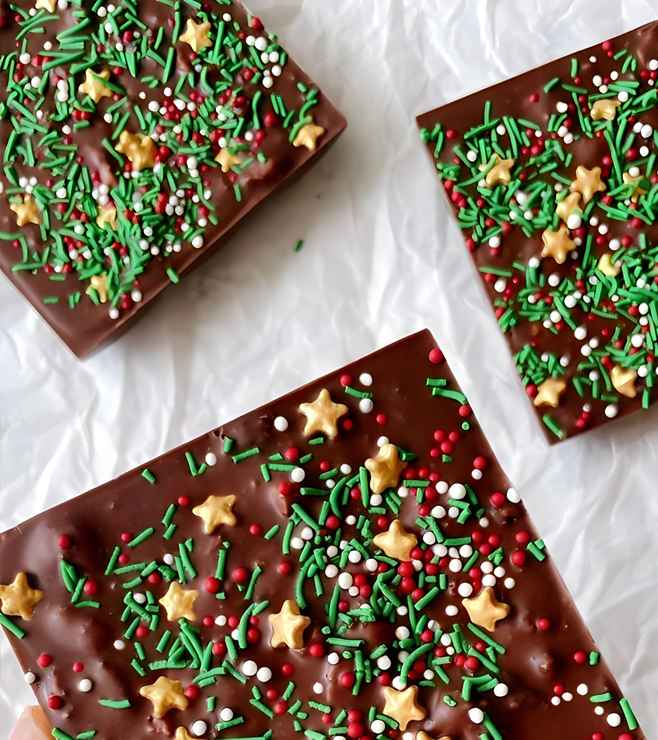 Who can resist a tray of Christmas-themed brownies decorated with green, white, and red sprinkles, topped with cheerful star-shaped decorations? These brownies make a delightful pairing with a festive bouquet of red poinsettias or holly. The comforting charm of these treats brings a cozy, homemade vibe to your gift.