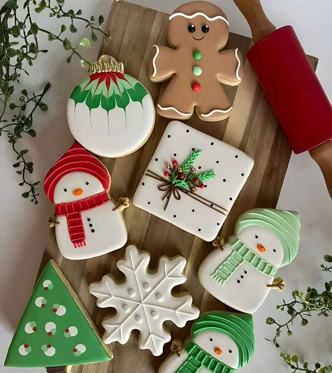 Add a touch of nostalgia to your floral gift with Winter Wonderland Cookies. These intricately designed Christmas-themed cookies feature motifs like snowflakes, Christmas trees, and stars. Pair them with a mixed bouquet of festive blooms for a gift that’s both playful and heartwarming.