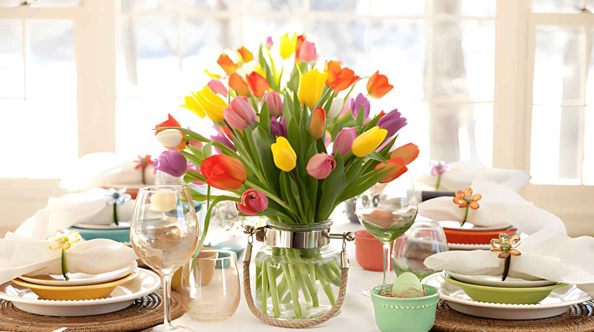 أولاً، ابدأ بقاعدة بسيطة. سلة سلكية مملوءة بالفواكه الطازجة أو الزهور، مثل زهور التوليب الزاهية، هي طريقة رائعة لإضافة اللون والملمس إلى طاولتك.