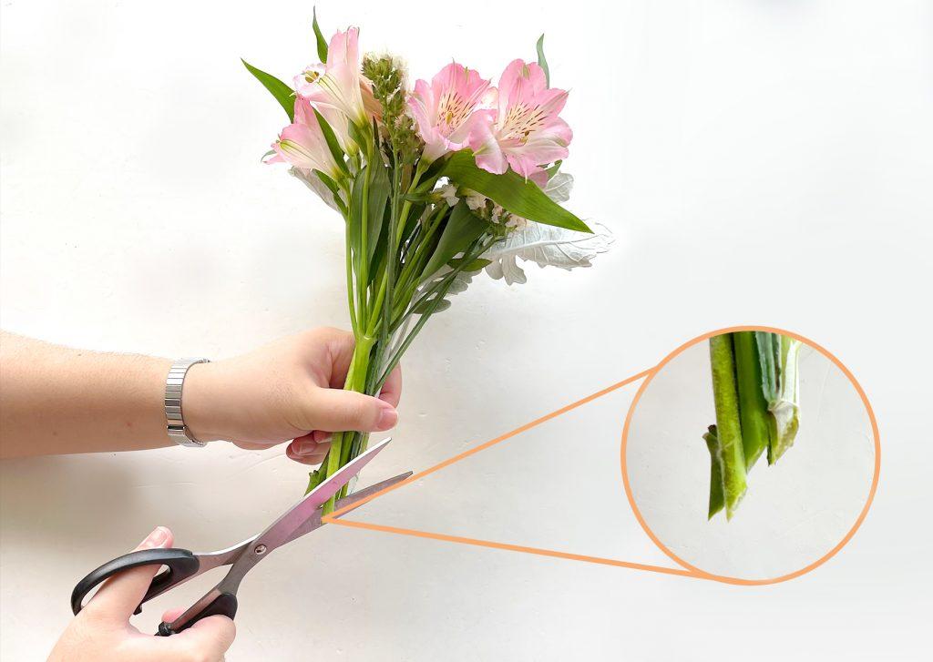 To keep your flowers fresher for longer, re-cut their stems daily at a 45-degree angle, roughly 34' to one inch. The ideal instrument to use would be a sharp floral cutter or scissors! - On another note, avoid breaking, fracturing, or piercing through the stems since this could potentially destroy water vessels, impeding water absorption.