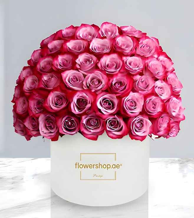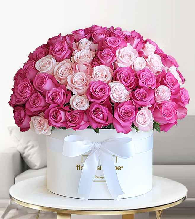 An eye-catching dome of fuchsia and soft pink roses arranged in a pristine white box and tied with a satin bow. This bouquet is pure perfection, just like the love you’ve received since the day you were born.