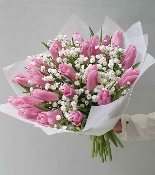 Tulips are known for symbolizing perfect love, while baby’s breath represents everlasting affection. Together, they’re gentle yet powerful.