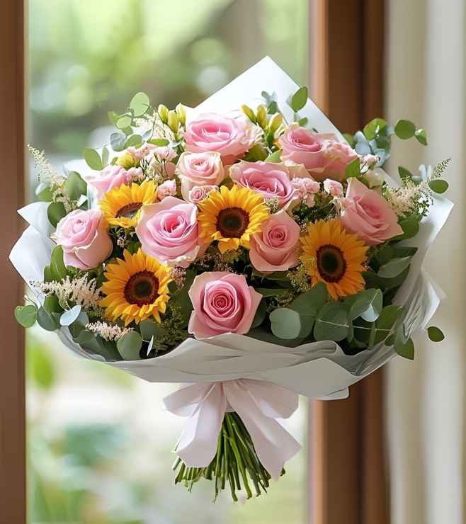 Sunflowers beam with brightness, while soft pink roses add tenderness to this joyful arrangement. This bouquet is perfect for a mother whose spirit lights up every room she enters.