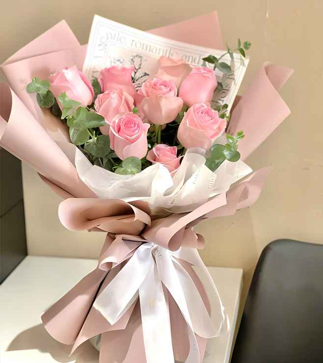 Elegant and dreamy, this bouquet features pale pink roses, eucalyptus sprigs, and a romantic palette of soft pastels. It’s gentle, thoughtful, and lovingly presented.