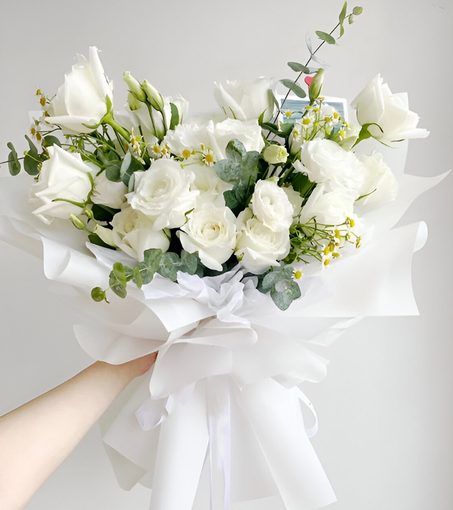 For those who appreciate minimalistic beauty, the Pure Elegance Bouquet is a flawless choice. White roses, wrapped in a pristine white sheet, create an aura of sophistication and purity. This bouquet is a beautiful way to convey peace and blessings to loved ones during Ramadan.
