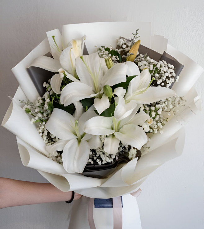 Lilies are often associated with purity and devotion, making them an ideal flower for Ramadan celebrations. The White Wonderland Bouquet, featuring delicate white lilies accented with fresh fillers and wrapped in a white sheet, exudes grace and serenity. This bouquet is perfect for adding a peaceful touch to any Ramadan setting or for gifting to someone special.