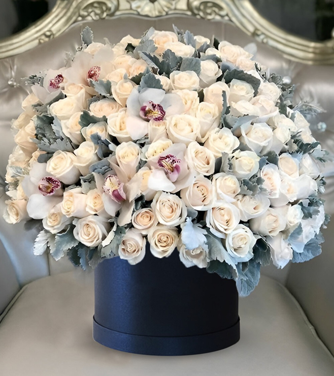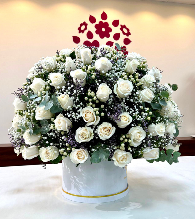 White roses signify purity, peace, and new beginnings—values that resonate deeply with Ramadan. This elegant arrangement, placed in a white hatbox and accented with fresh fillers, creates an atmosphere of serenity. Whether sent as a heartfelt gesture to a loved one or displayed as a stunning centerpiece, this arrangement adds a touch of sophistication to any setting.