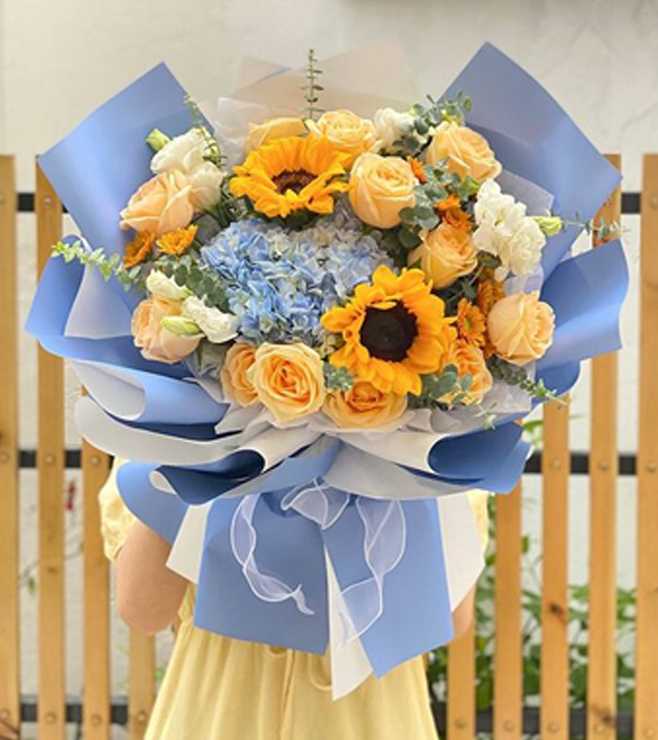 Ramadan is a time of light, and the Blooming Sunny Day Bouquet is a radiant representation of joy and positivity. With oranges and peach roses, sunflowers, and fresh fillers, this bouquet is wrapped in a beautiful sky-blue sheet and tied with a white translucent ribbon. Its bright and uplifting colors bring a cheerful ambiance to any home or gathering, making it an ideal choice for iftar hosts or loved ones.