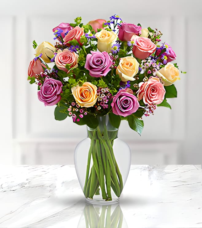 A stunning blend of pink, peach, and purple roses, the Rose Lovers Bouquet is a floral symphony of affection and elegance. Placed in a transparent vase and complemented by fresh fillers, this bouquet is perfect for expressing admiration and gratitude. Whether as a gift for a loved one or as a decorative piece for your home, this arrangement exudes warmth and love.