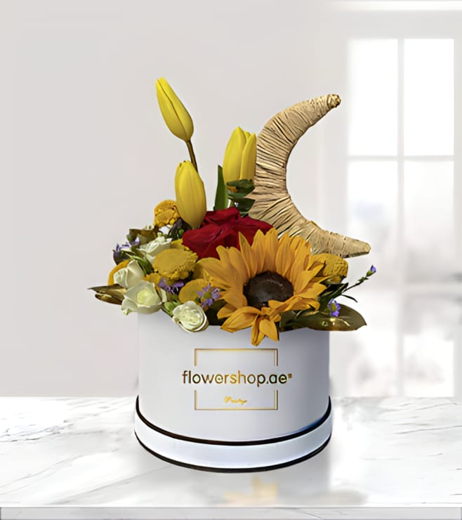 Nothing captures the spirit of Ramadan quite like the Crescent Moon Warm Greeting arrangement. Featuring a mix of vibrant blooms placed in a white hatbox with a crescent topper, this arrangement symbolizes the holy month beautifully. This elegant floral arrangement serves as a perfect Ramadan greeting and can be a meaningful gift for friends, family, or colleagues.