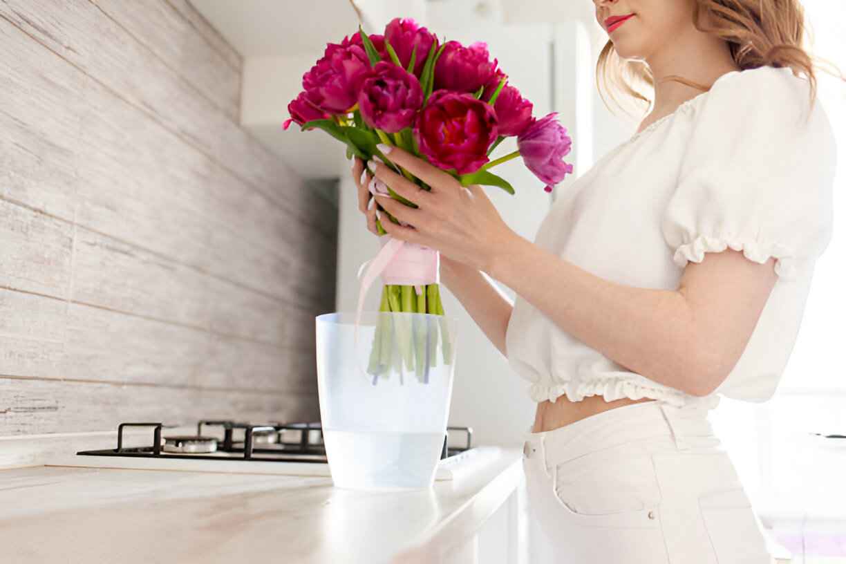 من المهم أيضًا وضع الزهور في ماء نظيف وفاتر فور استلامها لبدء عملية إعادة الترطيب وإعادة الحياة إلى أزهارك.