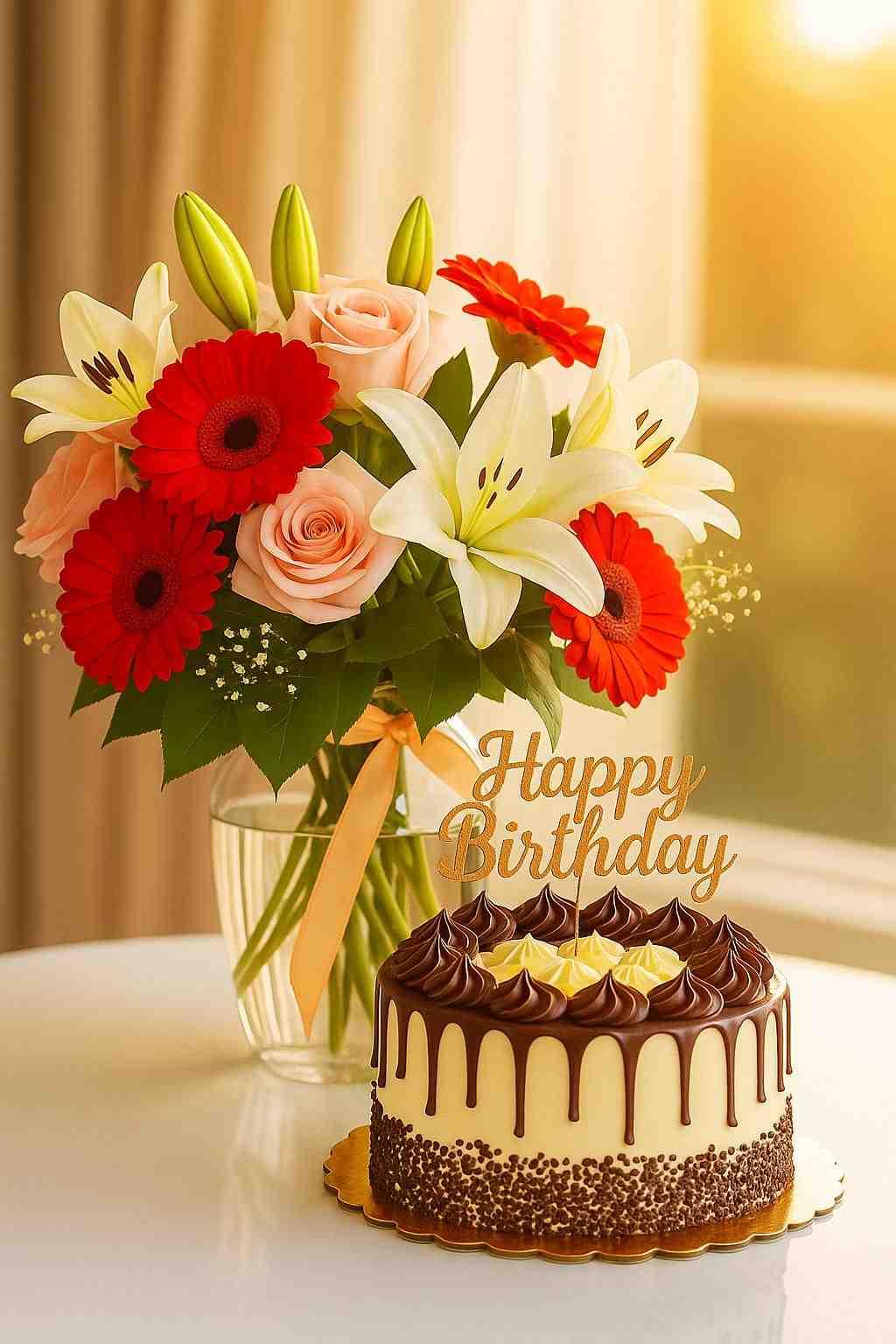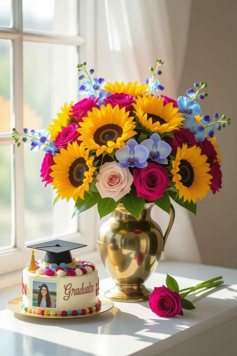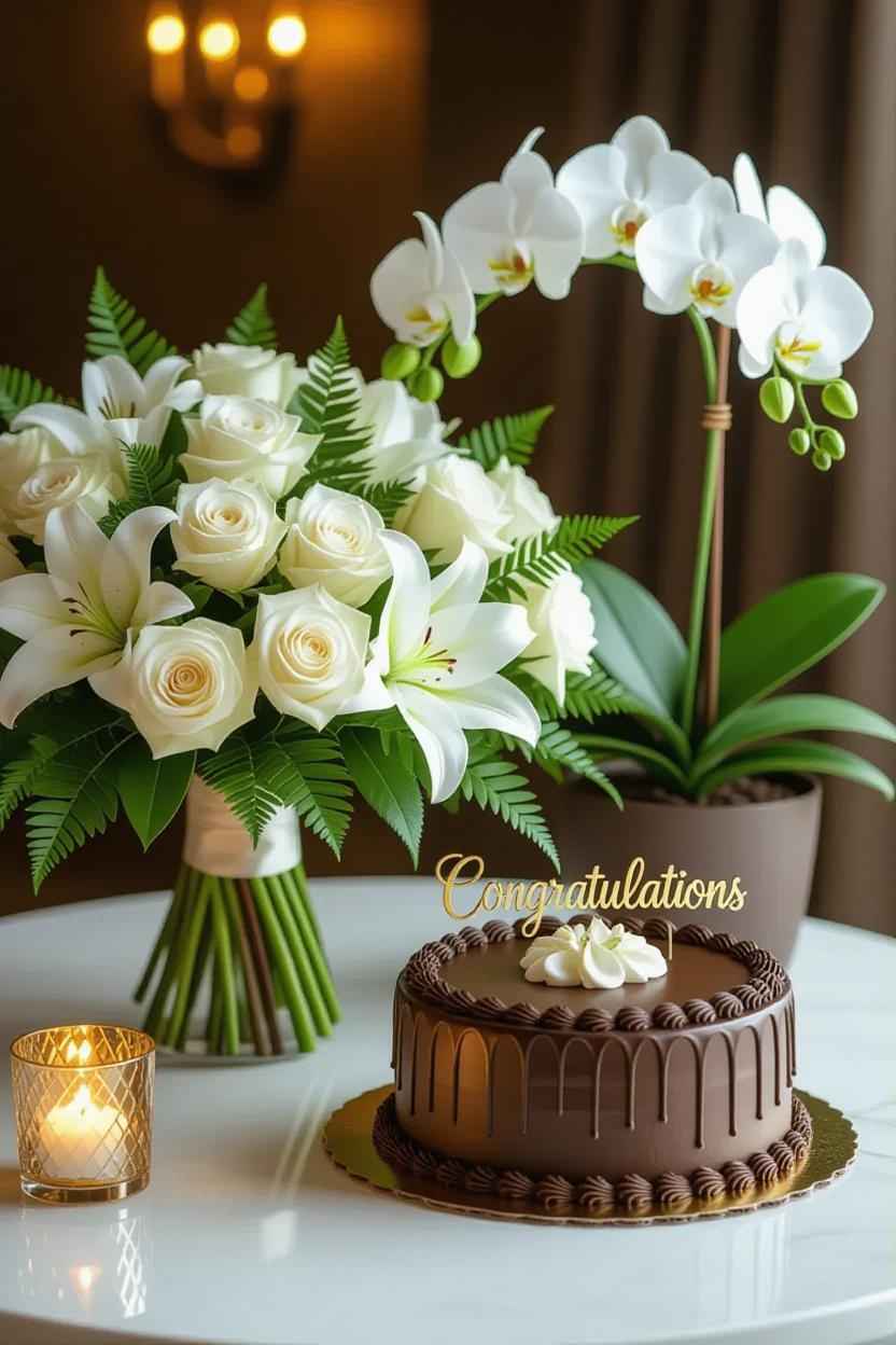 Flowers: Roses (classic celebration), gerberas (bright and cheerful), lilies (elegant).