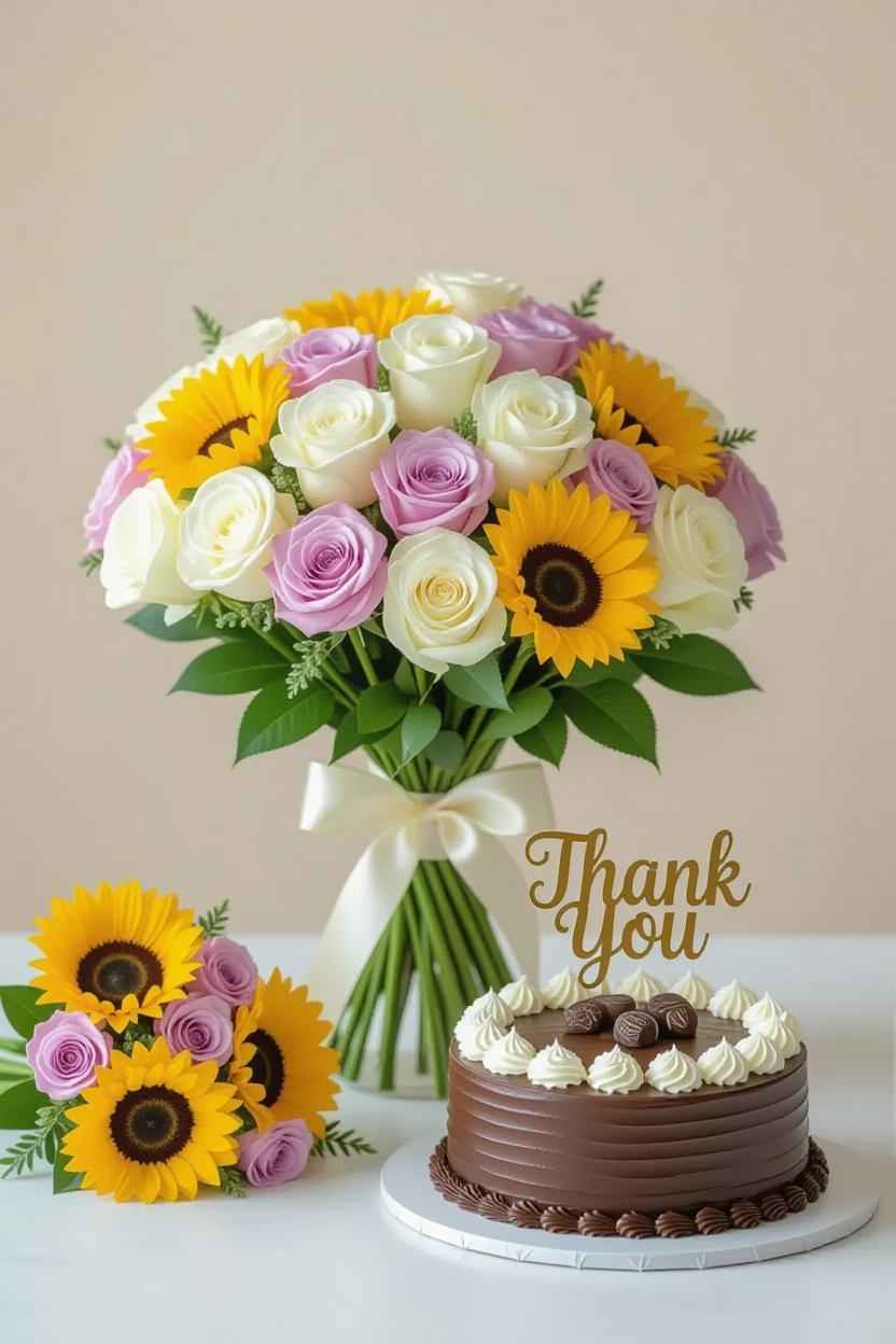Flowers: White roses (sincerity), pastel mixed bouquets (warmth), sunflowers (gratitude).