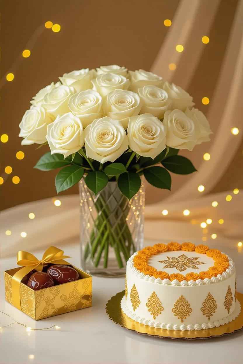 Ramadan/Eid gifts Dubai: Elegant white flowers, dates, and modest cake designs.