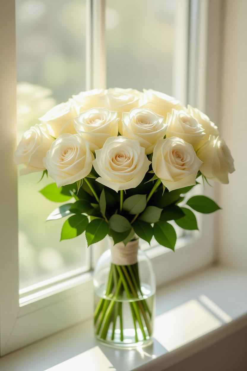Flowers: White lilies, white roses, or serene orchids.