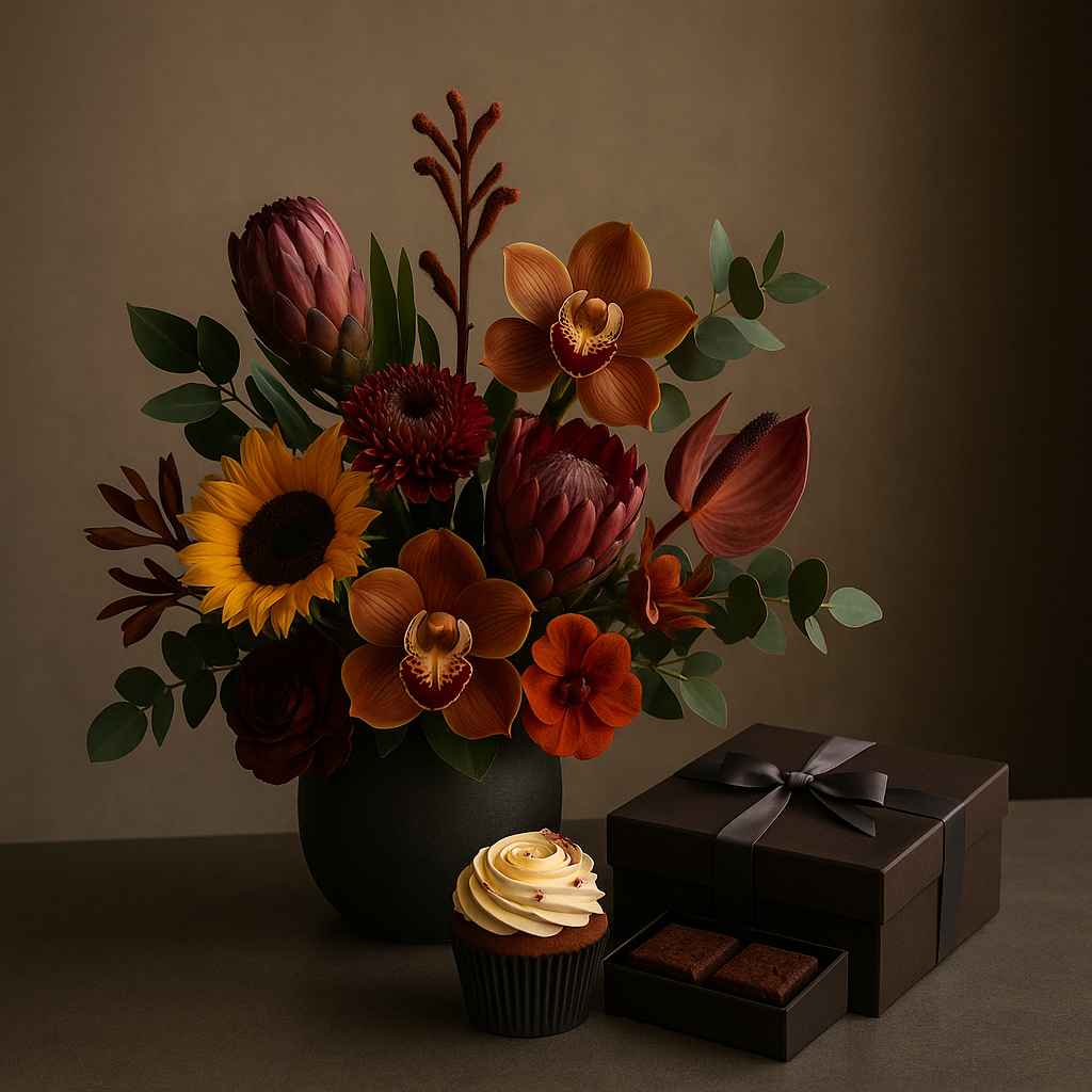 Bouquets paired with dark wrapping, ceramic vases, or even rustic wooden boxes can add a masculine edge. Pair them with gifts like cookies and brownies or keto cakes for an extra touch.