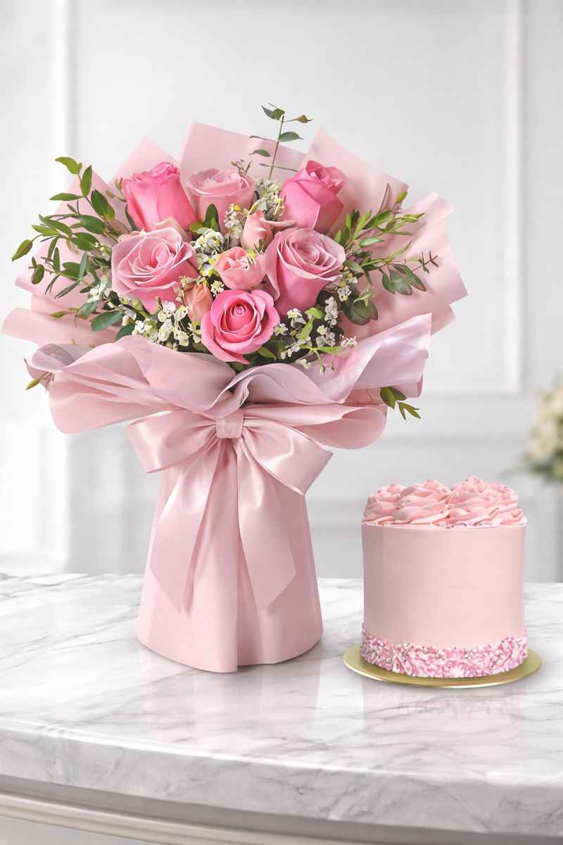 Flowers and cake are a classic pairing for a reason. A soft pink rose bouquet combined with a mini cake creates a balanced gift, romantic, sweet, and visually appealing. This combo is especially popular for Valentine’s Day because it offers variety while staying within budget, making it perfect for first-time Valentine’s celebrations or elegant surprises.