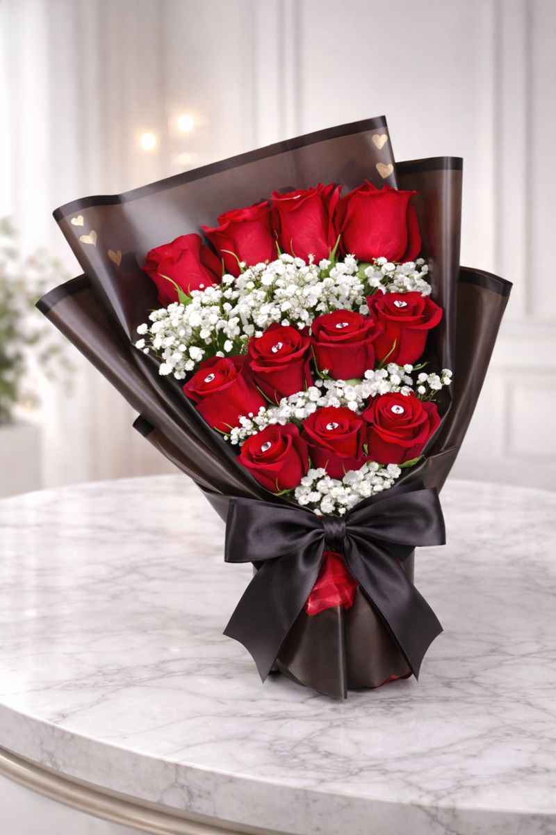 For those who love traditional romance with a softer touch, a red rose bouquet paired with delicate white baby’s breath is a perfect option. The contrast between deep red roses and light fillers creates a full, romantic look that feels luxurious while remaining budget-conscious.