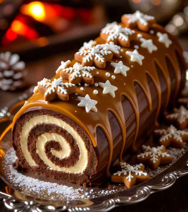 A holiday classic, the Yule log cake is given a modern twist with rich caramel, festive snowflake decorations, and a swirl of cream. This delightful dessert is the epitome of holiday indulgence, with layers of sponge cake and caramelized goodness. Its striking presentation makes it an eye-catching centerpiece at any holiday meal. Whether you're serving it at a Christmas party or gifting it to a friend, the Yule log cake offers the perfect balance of flavor and elegance.