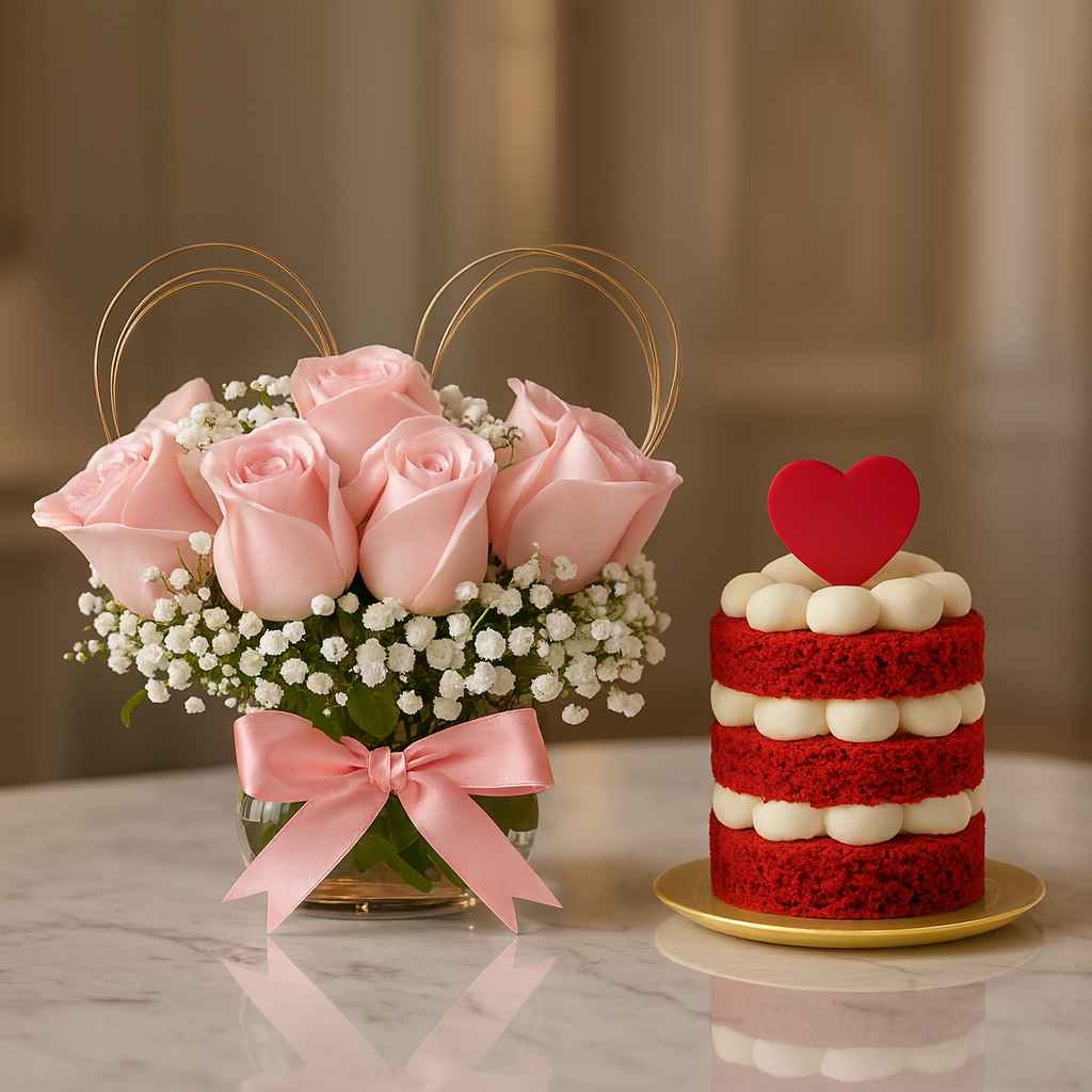 There’s something timeless about pairing delicate pink roses with a rich dessert, the soft colors convey affection, while the treat adds a touch of indulgence. This combination suits any situation where you want to express warmth without overdoing it, whether for a partner, a dear friend, or even a relative.