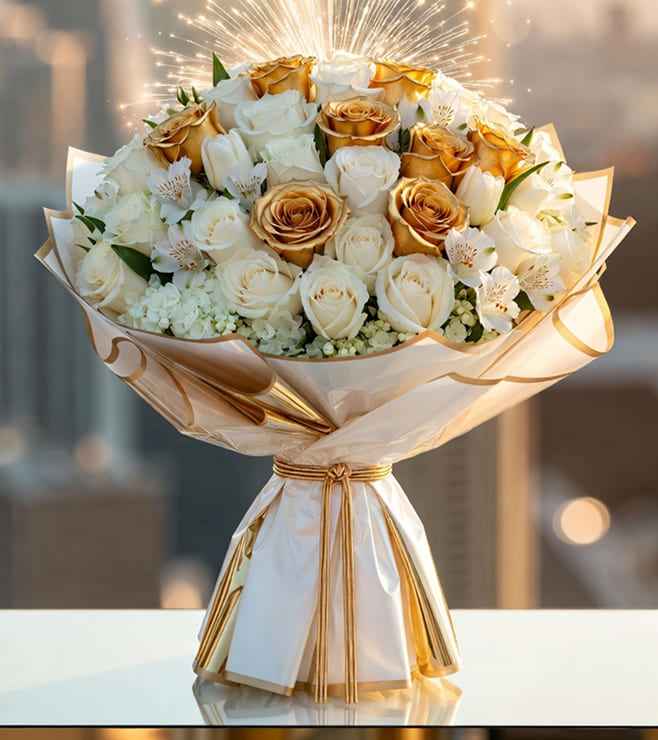 Refined-Beginning Bouquet is a glamorous arrangement of white blooms with golden roses, paired with a fireworks-style mood that screams celebration. It’s a strong choice for couples, VIP clients, or someone you want to impress because it feels like a grand gesture, photographs beautifully, and delivers that “main character” New Year energy in a tasteful way.