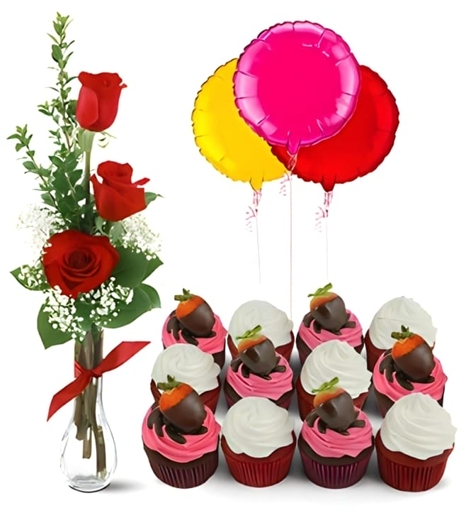 Send this Birthday Assortment and witness how you make the recipient's day brighter. Three red roses arrive in a clear vase topped off with a ribbon! We are also adding a balloon bouquet and two of our most popular cupcake flavors - Red Velvet Addiction & Strawberry Burst. Our Red Velvet cupcake is a southern classic that has won over the world with it’s ultra moist, ruby-colored interior and delicate crumb. Everyone will also be lining up for a taste of our Strawberry cupcake which begins with scrumptious chocolate cake crowned with an eye-catching, strawberry cream cheese frosting.