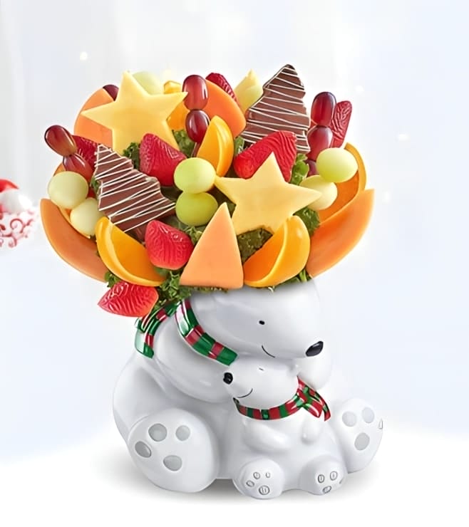 Send a holiday hug across miles with this sweet fruit bouquet arranged in our precious hand-painted ceramic, limited-edition polar bear vase! It’s brimming with the freshest oranges, pineapples, cantaloupe, sweet melon, strawberries and grapes. We’ve even added in our customer-favorite chocolate dipped pineapple trees for an extra special treat!