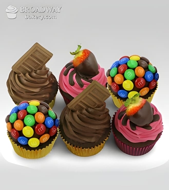 Everything in this collection is a little bite of heaven. The chocolate cupcake base is studded with chocolate chips topped with a silky cream cheese frosting blended with more chocolate. Everyone will also be lining up for a taste of our Strawberry cupcake which begins with scrumptious chocolate cake crowned with an eye-catching, strawberry cream cheese frosting. To complete the set we have also added our M&M cupcake. This has a moist, chocolate cake coated with a smooth chocolate ganache and embellished with a rainbow of M&M candy.