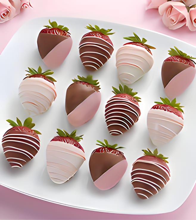 Surprise someone special with these incredible, mouthwatering creations! Each succulent strawberry is dipped and covered with nuts, chocolate chips or additional drizzle. The end result is a heavenly combination of flavors. This box contains 2 Strawberries Dipped in Belgian Milk Chocolate with Chopped Almonds and 2 Strawberries Dipped in Dark with Chocolate Chips. To complete the set we have also added 2 Strawberries Dipped in Belgian White Chocolate with Dark Swizzles. Each berry arrive fully covered in chocolatey goodness