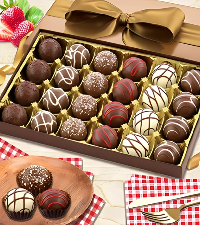 Savor the sublime experience of our artisanal truffles, meticulously handcrafted to captivate your senses with every bite. Each truffle is a masterpiece of flavor and texture, carefully made with the finest ingredients and infused with exquisite indulgence. Delight in the velvety smoothness of our chocolate ganache, enrobed in a delicate shell and adorned with a touch of elegance. Whether you're indulging in a moment of self-pampering or seeking the perfect gift for a loved one, our truffles promise to elevate any occasion with their decadent allure.